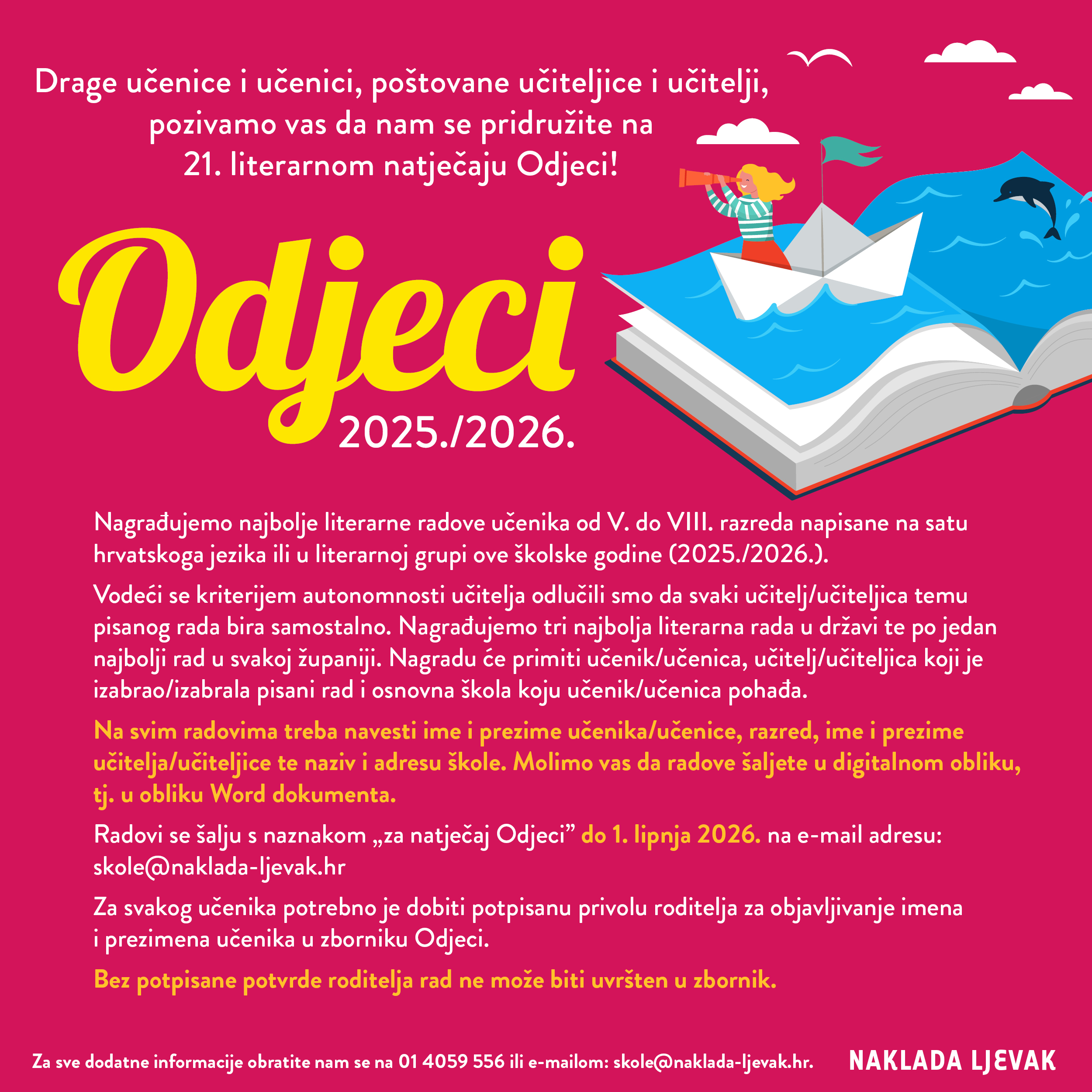 Radovi se šalju s naznakom „za natječaj Odjeci“ do 1. lipnja 2026. na e-mail adresu: skole@naklada-ljevak.hr